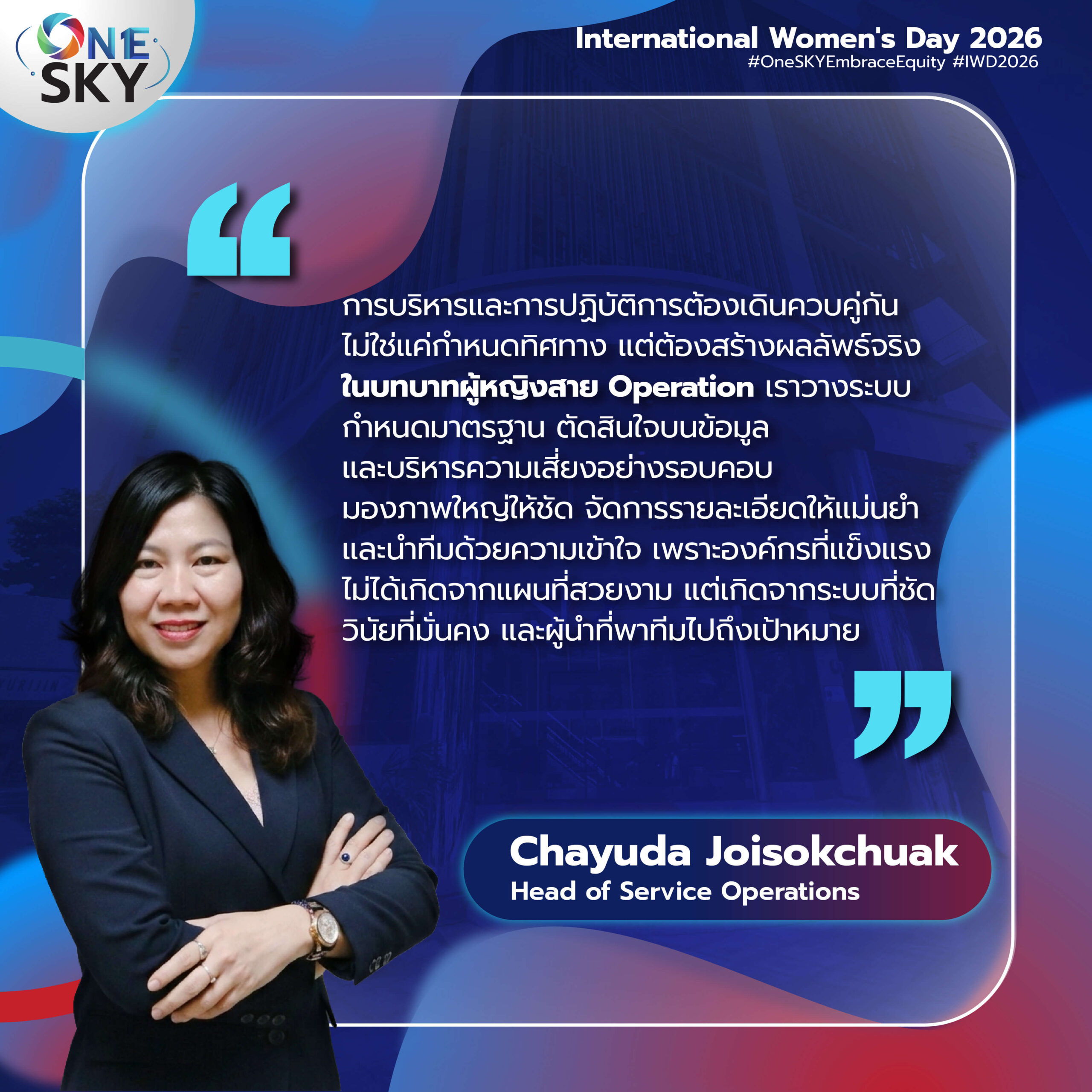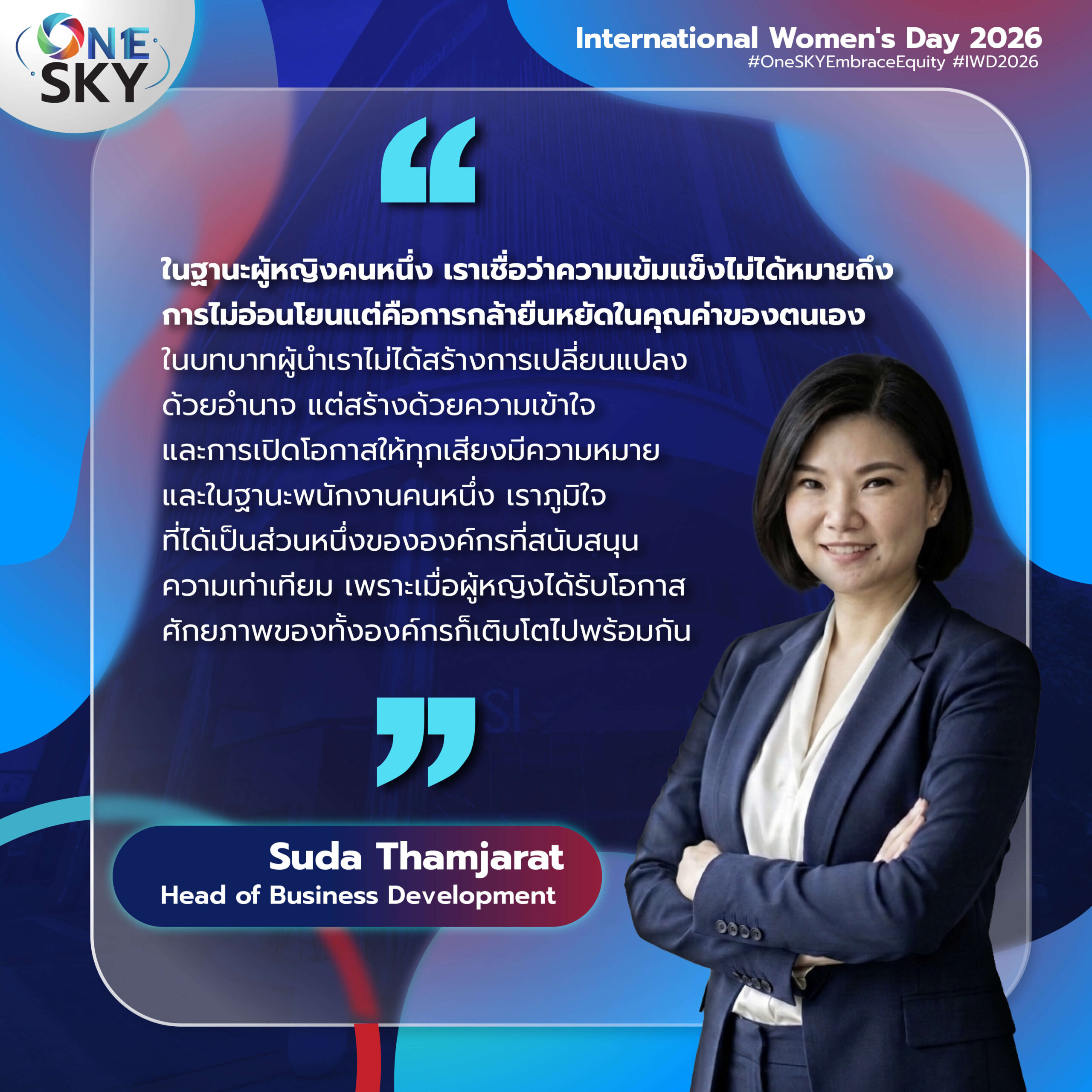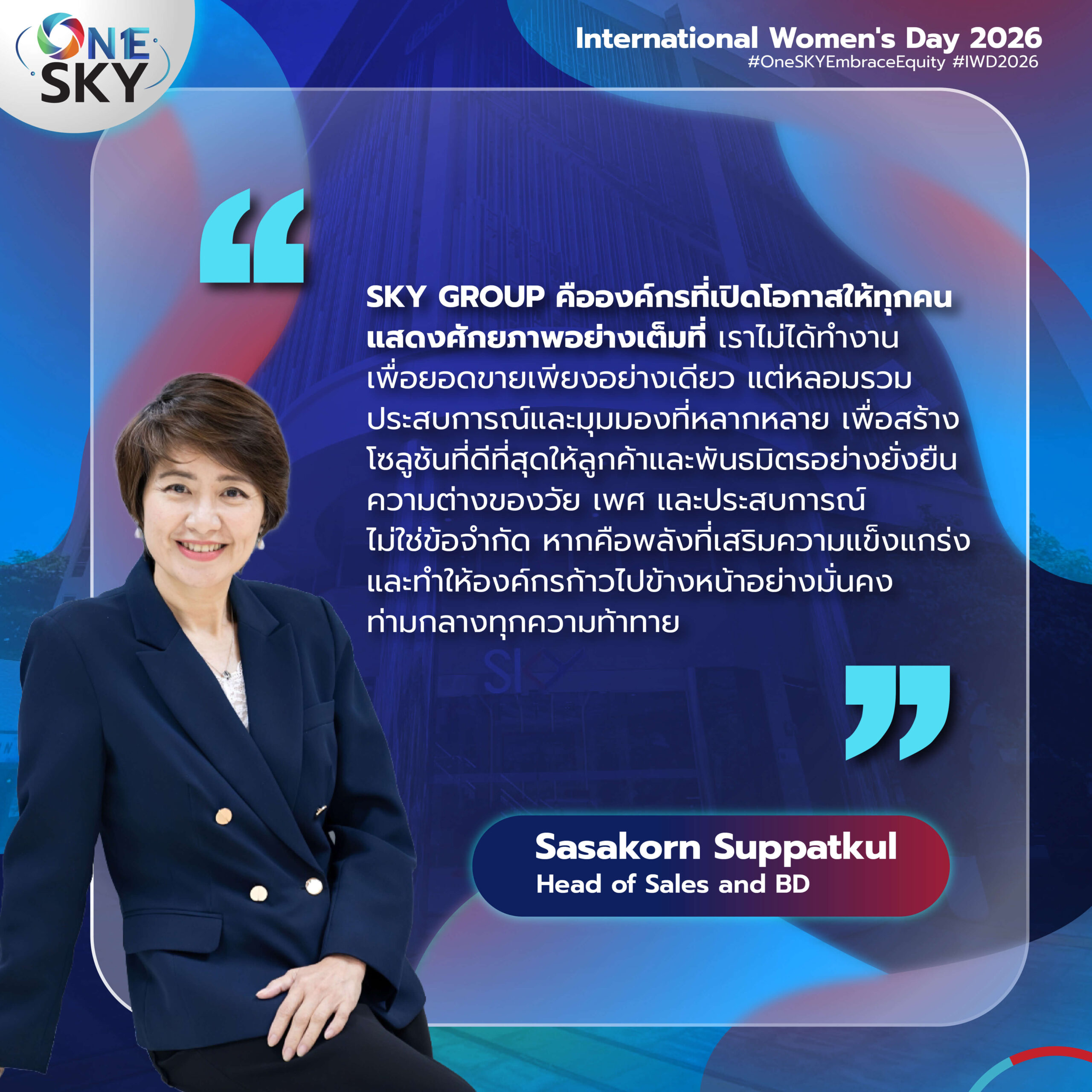 เราเชื่อว่า “ความหลากหลาย” ไม่ใช่แค่ความแตกต่าง แต่คือพลังสำคัญที่ช่วยสร้างมุมมองใหม่ จุดประกายไอเดีย และผลักดันให้องค์กรเติบโตได้อย่างแข็งแกร่งและยั่งยืน ผู้หญิงใน SKY Group จึงไม่ได้เป็นเพียงส่วนหนึ่งของทีม แต่คือแรงขับเคลื่อนที่สำคัญในทุกความสำเร็จ